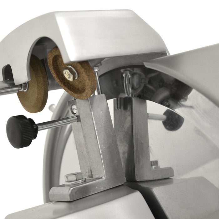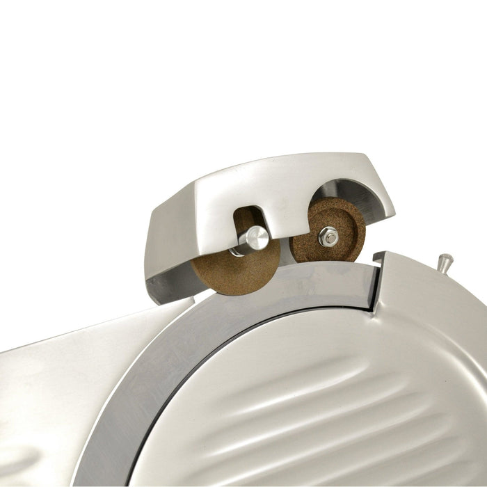For precise portion control, it includes an adjustable thickness knob that allows operators to calibrate slices from 0 to 16 mm. To maintain peak performance, the unit is equipped with a blade that have hollow ground taper for extended sharpening and life. This feature supports high-speed food preparation workflows and maintaining product quality.
