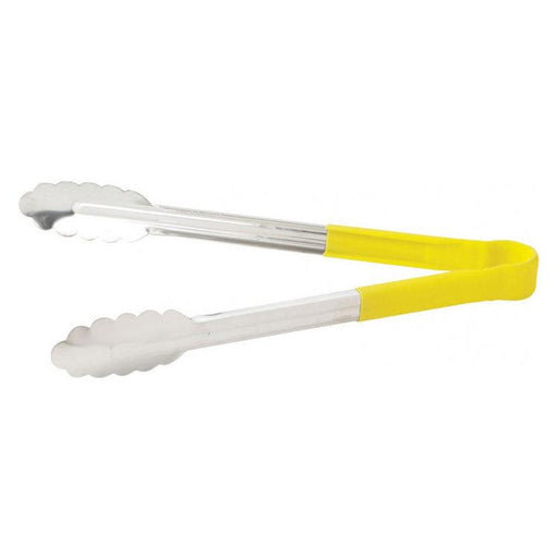 Featured a durable stainless steel with plastic coated handle, these Nella 9" Heavy-Duty Utility Tongs with Yellow Handle are great additions to any kitchen.
