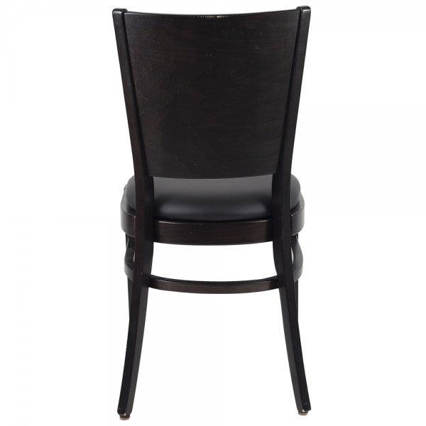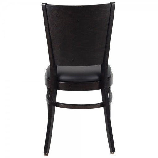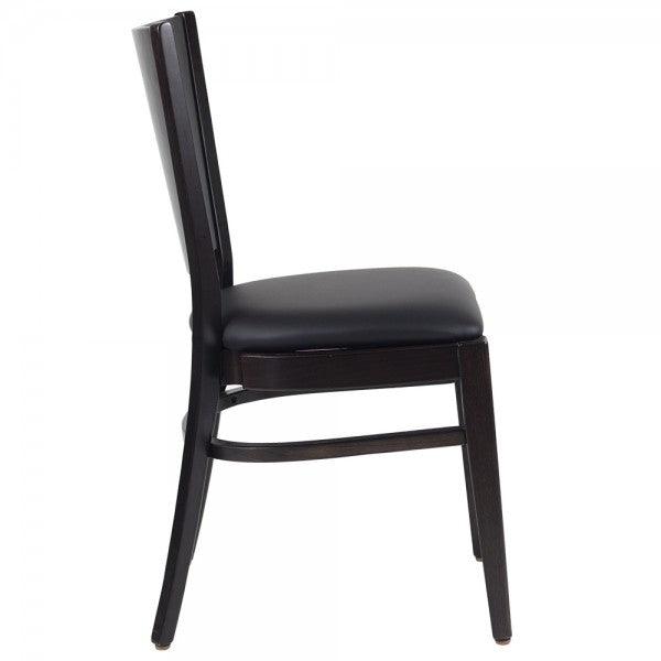 Add an elegant touch to your restaurant with this Nella Lisbon Black Vinyl Wood Restaurant Chair. The chair's black vinyl seat combines with a curved backrest to not only provide excellent support, but also add a distinct aesthetic appeal to any restaurant, bar, or bistro.