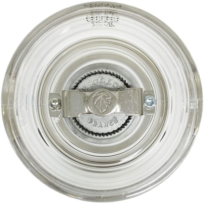In a similar style to Peugeot's Paris Classic wooden mills, Nancy mills are made with crystal clear acrylic. The grind is adjusted by turning the top nut: turn it clockwise (tighten) for a finer grind; counter-clockwise (loosen) for a coarser grind. This mill is equipped with Peugeot’s legendary pepper grinding mechanism. Made of case-hardened steel, it has received additional treatment against wear and corrosion. Its double-row of helix-shaped claws grab and crack each peppercorn before drawing it down to the teeth for the perfect grind. Mill is 8.75 inches tall.