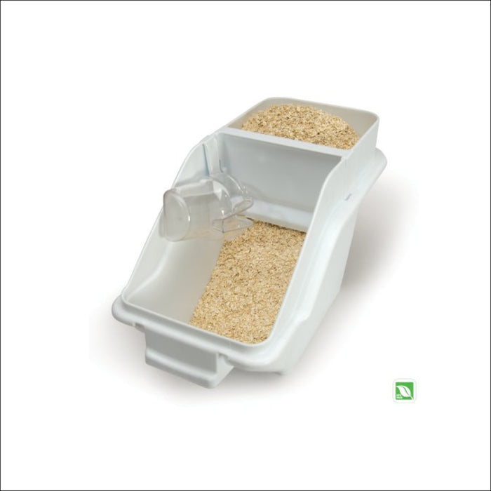 - The patent pending scoop hook system allows the scoop to be stored inside the bin and out of the product for quick access