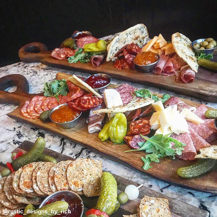 Astound your guests and customers by serving up your signature antipasto on a one-of-a-kind 24” charcuterie board, handcrafted by Rustic Designs by Rich.
