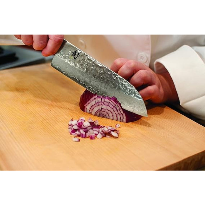 The Shun Premier 7-in. Santoku is a beautiful, Asian-inspired chef's knife that many cooks today have added to their kitchen favorites. A knife of many talents, a santoku easily handles all the basic kitchen cutting tasks. Slightly shorter than the standard chef's knife, the Shun Premier Santoku is light, agile, and very easy to maneuver. There's just enough belly curve to enable rocking cuts, which just adds to the Premier Santoku's versatility. We think you'll find that the Shun Premier 7-in. Santoku works beautifully and fits your hand like a glove. The santoku is as easy to use as a chef's knife and is especially well suited to a down-and-forward cutting motion (push cut). Many cooks swear by their santoku for top performance.