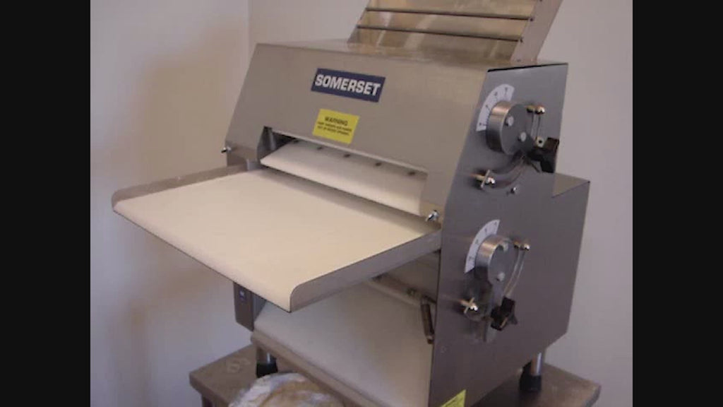 Sheet large batches of dough with ease using this Somerset CDR-1550 15" countertop two stage front-operated dough sheeter! This dough sheeter is designed to quickly and easily roll out dough up to 15" in diameter for anything from your signature pizzas to your scratch-made pierogis. Featuring a large hopper, this unit allows a single operator to roll out up to 600 pieces of dough per hour with ease! Its 15" long plastic non-stick roller easily adjusts to your desired thickness, ensuring a precise, uniform sheet of dough every time. The non-stick quality of the rollers prevents dough from building up, minimizing waste and keeping the unit easy to clean. Not only does this unit reduce the amount of physical work needed to create sheets of dough, but it also helps save on time and labor costs to further increase your operation's efficiency.