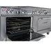 The base includes 2 full-size standard ovens, each delivering 45,000 BTUs and featuring a thermostat range from 79°C to 287°C (175°F to 550°F). The oven interiors are lined with porcelain enamel and sized to fit full-size sheet pans in both directions. Each oven cavity is equipped with one rack and 2-position side rails, supporting flexibility for baking, roasting, and holding. The range operates on Natural Gas and includes standing pilot ignition for the top burners and battery spark ignition for the ovens.