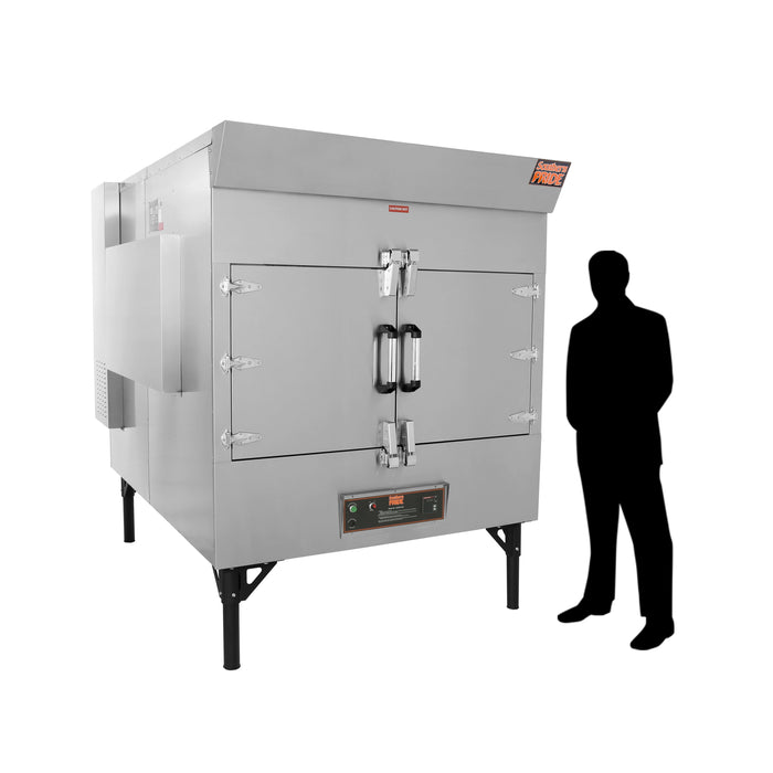 The 150,000 BTU (44KW) burner heats the smoker cabinet and ignites the 2-3 fireplace size logs in the firebox to obtain the desired flavor, aroma, and texture. The convection fan draws the smoke from the firebox and circulates the smoke throughout the smoker cooking cabinet. The Subterthermic® front or rear flue increases the smoke flavor of the product, increases the heat efficiency, and reduces the wood usage.