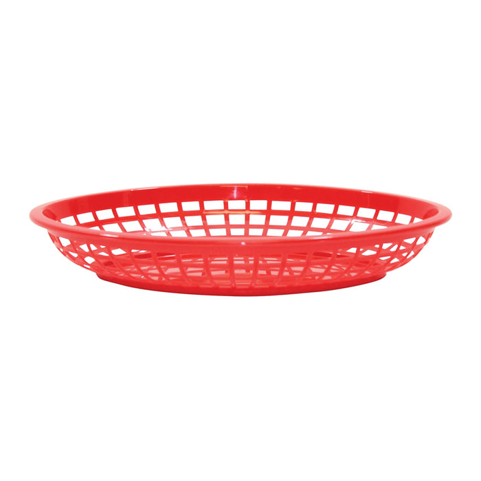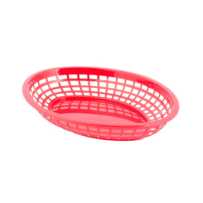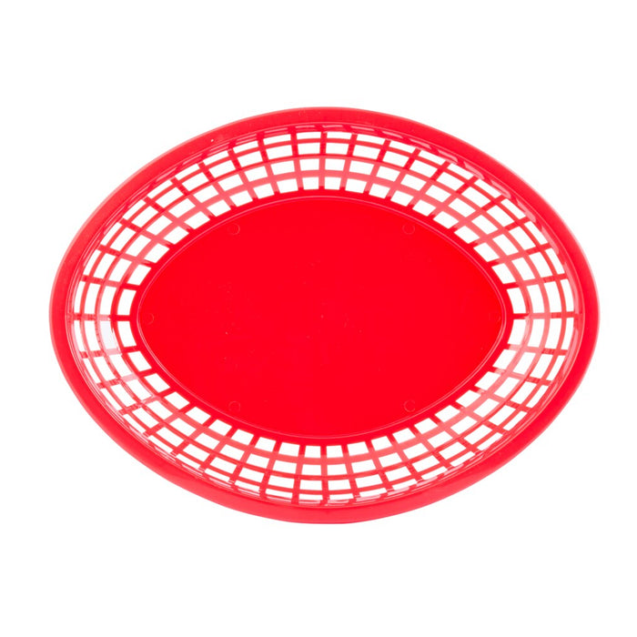 The TableCraft 1084R Jumbo Oval Plastic Basket in vibrant red is a must-have piece of serveware for any casual dining establishment, food truck, or cafe. Measuring 11.75 inches by 9 inches, this generously sized basket seamlessly combines functionality with style, offering an ample space to accommodate a variety of foods ranging from burgers and fries to sandwiches and snacks. Its modern oval shape not only enhances presentation but also optimizes table space for a neat and organized dining experience.