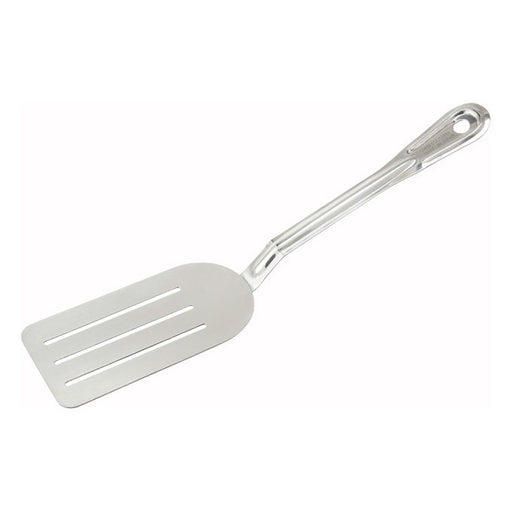 This Tablecraft 461W 6" x 4.5" Square Stainless Steel Wide Turner is ideal when it comes to cooking larger pieces of meat. It's great to use when large crowds are in the restaurant or diner.