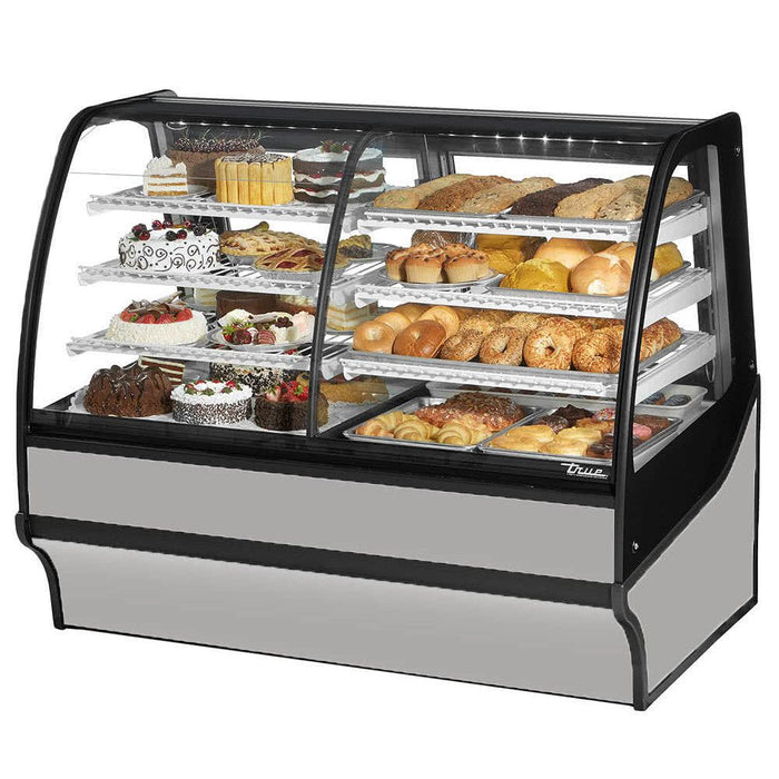 True TDM-DZ-59-GE/GE 59" Stainless Steel Curved Glass Dual Zone Refrigerated Bakery Display Case With White Interior
