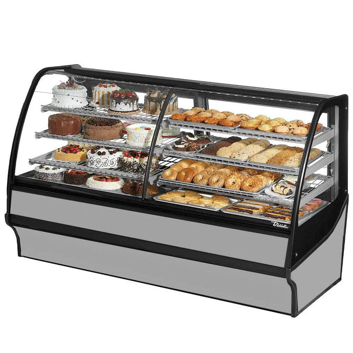 True TDM-DZ-77-GE/GE 77" Stainless Steel Curved Glass Dual Zone Refrigerated Bakery Display Case With Stainless Steel Interior