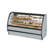 The True TGM-DC-77-SM/SM-S-W 77" Stainless Steel Dry Merchandising Display Case with White Interior & Side Mirrors combines efficient, high volume merchandising with an elegant curved glass front for sophisticated presentation of high end desserts and pastries.