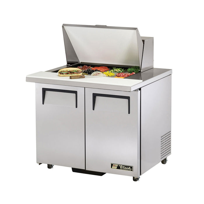This True TSSU-36-12M-B-ADA-HC 36" ADA Compliant Mega-Top Solid Door Sandwich/Salad Refrigerated Table is designed using the highest quality materials and oversized refrigeration systems provides the user with colder product temperatures, lower utility costs, exceptional food safety and the best value in today’s food service marketplace.
