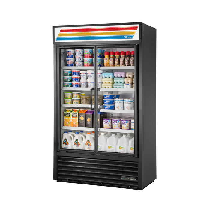 True TVM-48SL-HC~VM01 47" Slim Line Glass Door Merchandising Refrigerator is designed using the highest quality materials and factory balanced refrigeration systems provides the user with colder product temperatures, and lower utility costs in an attractive visual merchandiser that brilliantly displays packaged food and beverages.