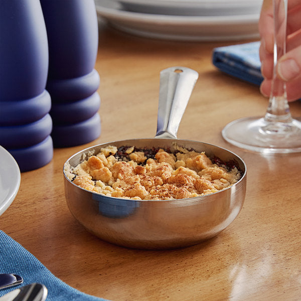 Surprise your guests with this delightful Vollrath 59759 8 oz. mini stainless steel fry pan. Used for serving, not cooking, this vessel provides a quirky and fun way to serve sauces or sides! The mini fry pan can also be used to hold fresh fruit, steamed vegetables, and desserts. Made from durable stainless steel with a glistening mirror finish, this piece is not just charming but is sure to stand up to the demands of daily use in your establishment.