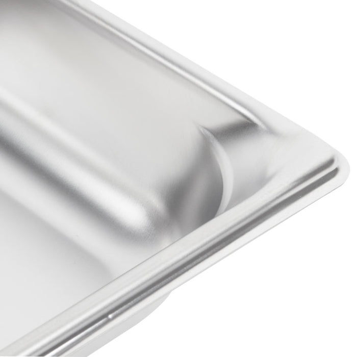 This durable 22-gauge 300-Series stainless steel pan is EN631-1-compliant for worldwide use. It features strong, reinforced spout-shaped corners that make it easy to pour and scoop out food. The pan also features flat edges with higher rims to prevent loss of steam for increased efficiency. Anti-jam stacking lugs enable easy separation and lifting of the pan.