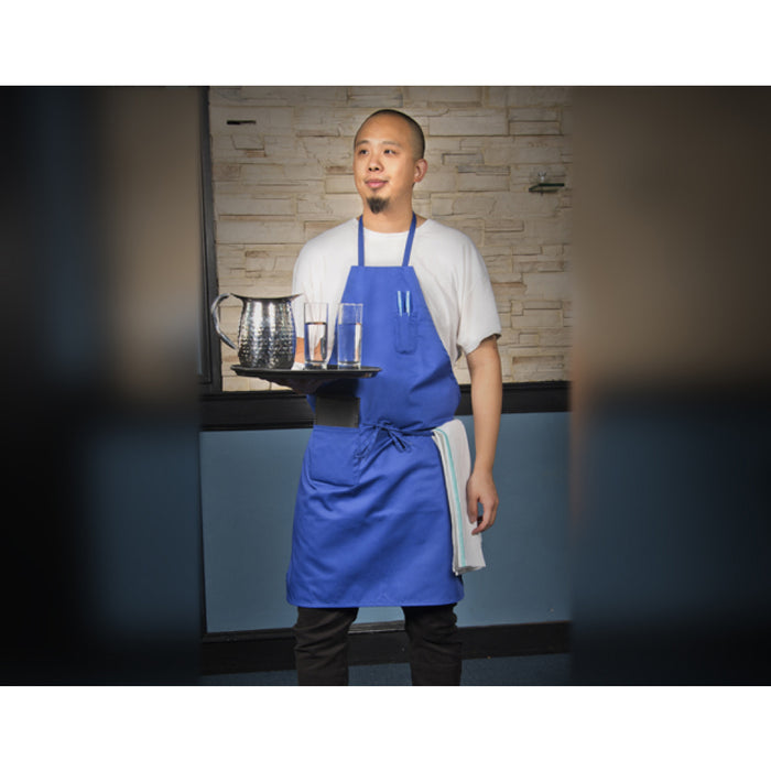 The Winco BA-PBL 33" Blue Full-Length Bib Apron with Pockets is the perfect accessory for any wait staff. This apron is made of cotton-poly blend is both lightweight and durable. It features two large pockets for holding items like pens, notepads, or other items needed while working. The waist ties are adjustable for added comfort, and the 33" length provides full coverage. The blue color of the apron is both classic and modern, making it perfect for any professional setting.