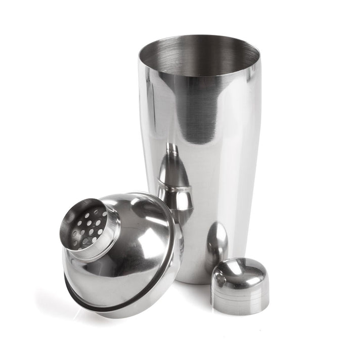 Featuring a classic design, gleaming finish, and sleek silver color, this amazing shaker set consists of cup, strainer, and cap. The cap creates a tight seal helping to prevent spills and leaks during mixing and serving, while its built-in strainer allows you to easily pour your beverages without ice falling into the glass.