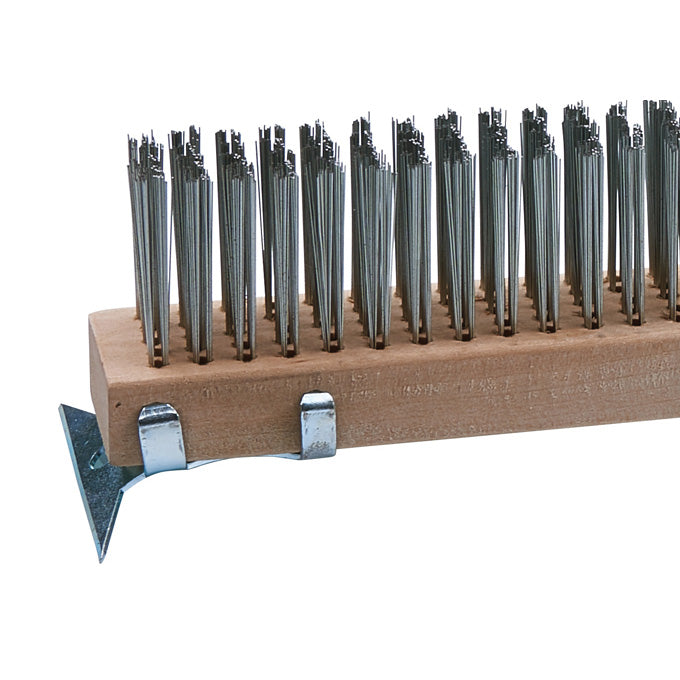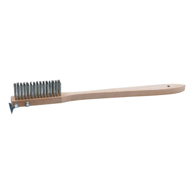 Use this Winco BR-500 20" Scratch Brush with Wire Bristles for scrubbing grills, ovens, and pans. Equipped with tough wire bristles and a rust-proof steel scraper, this scratch brush easily removes burnt-on food build-up.