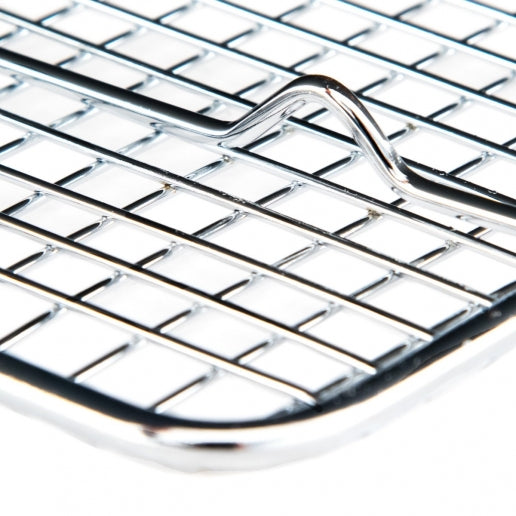 Featuring a grid pattern, this pan grate facilitates fast drainage and allows proper air circulation while its built-in feet offer excellent support. For outstanding durability, this pan grate is made from chrome-plated steel wire that withstands high temperatures without warping. This grate is designed to fit in a half-size sheet pan or bun pan and provides plenty of finger room at the corners for convenient removal.