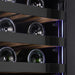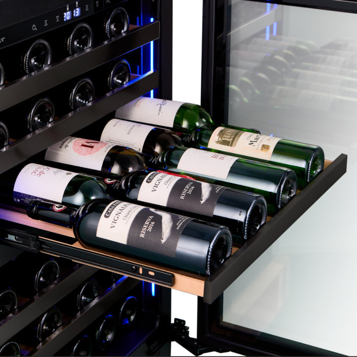 The UV-resistant glass door protects your wine from harmful light exposure, while the energy-efficient blue and white LED lighting inside ensures visibility. Equipped with 5 wooden shelves that smoothly glide on telescopic rails, providing sturdiness and flexibility. The intuitive digital control panel is user-friendly.