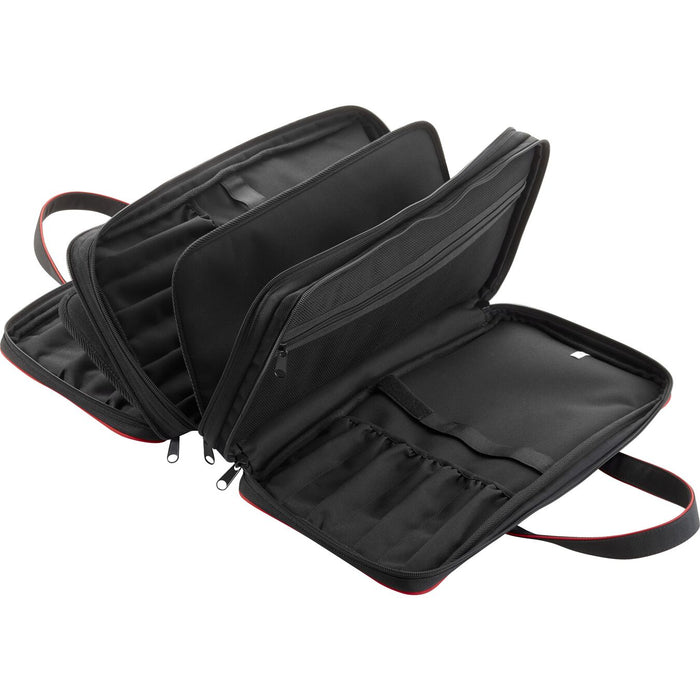 This black ZWILLING knife bag has a modern look, which is additionally rounded off by the red edges of the bag. The two carrying handles or the shoulder strap, which can also be removed if necessary, ensure easy carrying. With its generous compartments, the knife pocket offers storage space for up to 20 knives. The compartments can be individually zipped. In addition, the bag has separate storage space for small utensils. The ZWILLING knife bag is the ideal choice for professionals and hobby cooks who want to transport their knives safely and comfortably.