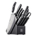 - Set Includes: 4” Paring Knife, 5” Utility Knife Serrated, 5” Santoku Knife, 8” Chef Knife, 8” Bread Knife, Shears, 4 x steak knives, Hardwood block stained - Black, 9” Honing Steel