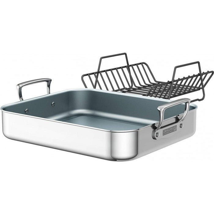 Zwilling Plus Stainless Steel Roasting Pan with rack is made with premium SIGMA Clad 3-ply construction for rapid and even heat distribution. Large stainless steel handles are secured with heavy-duty rivets, ensuring comfortable control and firm grips even when wearing oven mitts. Flared rim for easy, non-drip pouring. PFOA-free non-stick rack insert elevates food to promote fast and even cooking and browning.